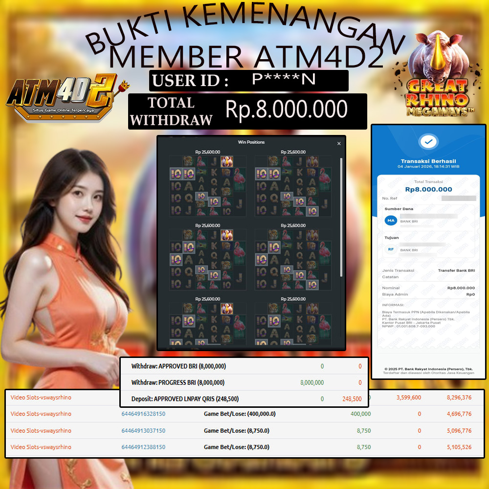 ATM4D2 dikenal sebagai situs terpercaya yang selalu menghadirkan pengalaman bermain slot online yang aman, fair, dan berlisensi resmi. Di sini, kami tidak hanya sekadar memberikan janji, tapi bukti nyata berupa slip kemenangan yang dapat Anda lihat secara langsung.