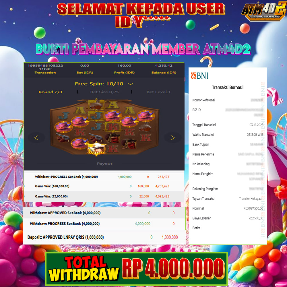 ATM4D2 dikenal sebagai situs terpercaya yang selalu menghadirkan pengalaman bermain slot online yang aman, fair, dan berlisensi resmi. Di sini, kami tidak hanya sekadar memberikan janji, tapi bukti nyata berupa slip kemenangan yang dapat Anda lihat secara langsung.