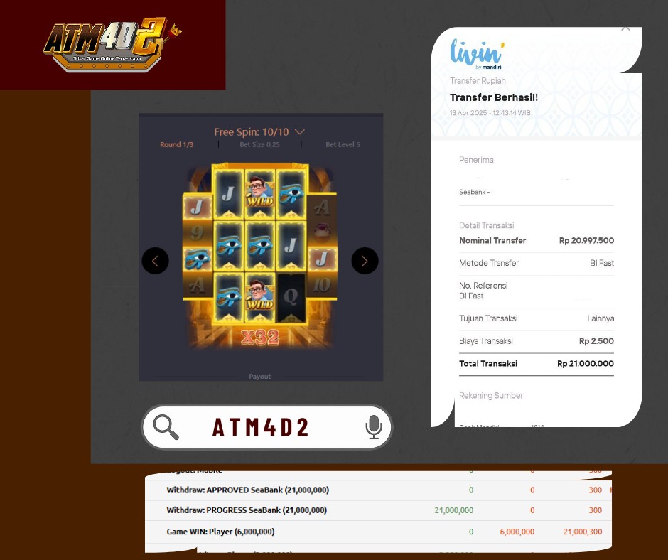ATM4D2 dikenal sebagai situs terpercaya yang selalu menghadirkan pengalaman bermain slot online yang aman, fair, dan berlisensi resmi. Di sini, kami tidak hanya sekadar memberikan janji, tapi bukti nyata berupa slip kemenangan yang dapat Anda lihat secara langsung.