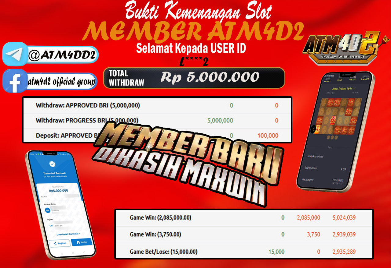 ATM4D2 dikenal sebagai situs terpercaya yang selalu menghadirkan pengalaman bermain slot online yang aman, fair, dan berlisensi resmi. Di sini, kami tidak hanya sekadar memberikan janji, tapi bukti nyata berupa slip kemenangan yang dapat Anda lihat secara langsung.