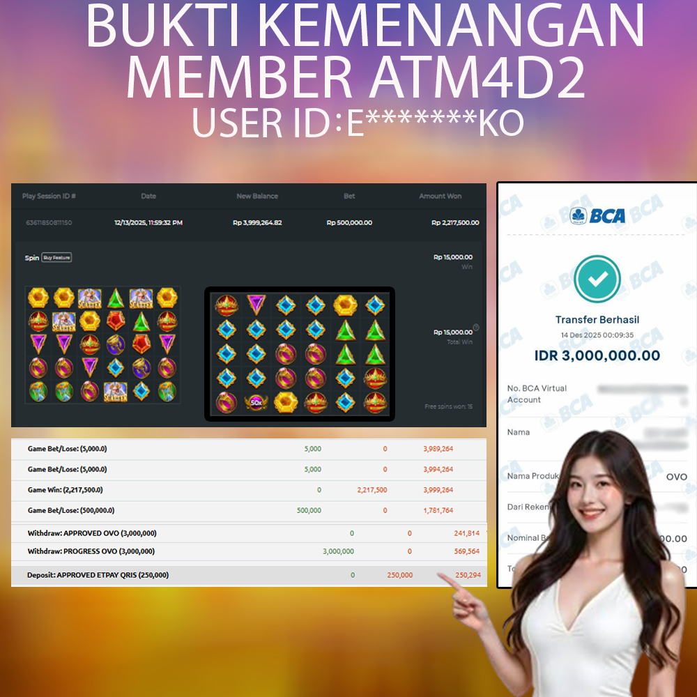 ATM4D2 dikenal sebagai situs terpercaya yang selalu menghadirkan pengalaman bermain slot online yang aman, fair, dan berlisensi resmi. Di sini, kami tidak hanya sekadar memberikan janji, tapi bukti nyata berupa slip kemenangan yang dapat Anda lihat secara langsung.