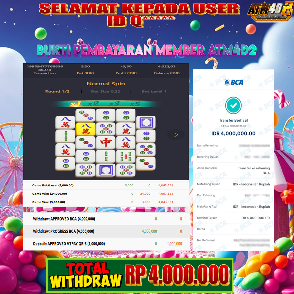 ATM4D2 dikenal sebagai situs terpercaya yang selalu menghadirkan pengalaman bermain slot online yang aman, fair, dan berlisensi resmi. Di sini, kami tidak hanya sekadar memberikan janji, tapi bukti nyata berupa slip kemenangan yang dapat Anda lihat secara langsung.