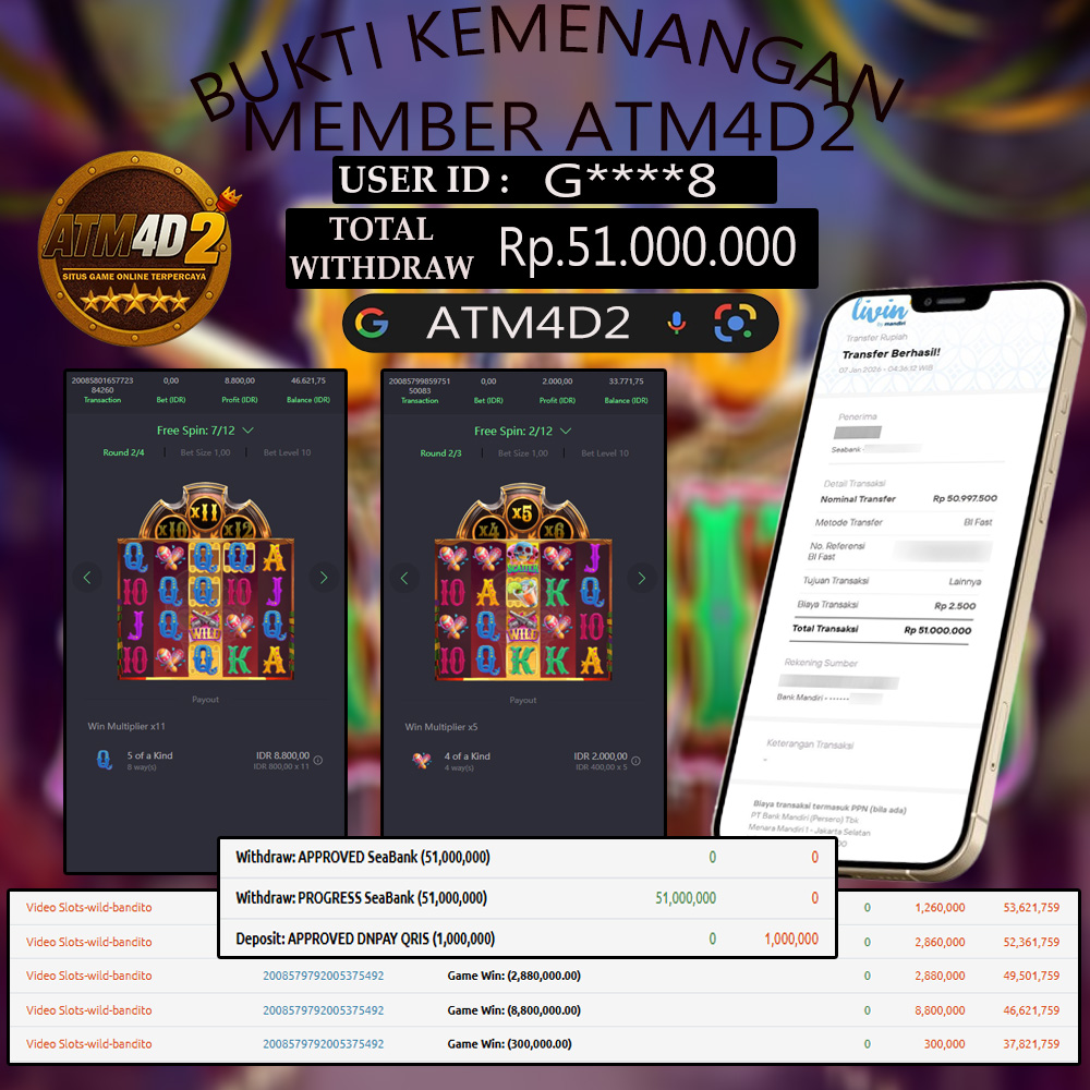 ATM4D2 dikenal sebagai situs terpercaya yang selalu menghadirkan pengalaman bermain slot online yang aman, fair, dan berlisensi resmi. Di sini, kami tidak hanya sekadar memberikan janji, tapi bukti nyata berupa slip kemenangan yang dapat Anda lihat secara langsung.