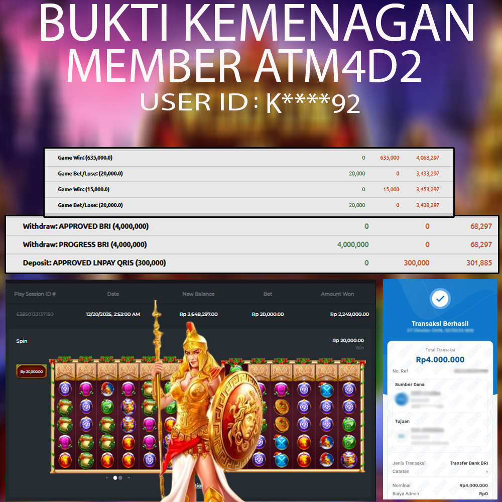 ATM4D2 dikenal sebagai situs terpercaya yang selalu menghadirkan pengalaman bermain slot online yang aman, fair, dan berlisensi resmi. Di sini, kami tidak hanya sekadar memberikan janji, tapi bukti nyata berupa slip kemenangan yang dapat Anda lihat secara langsung.
